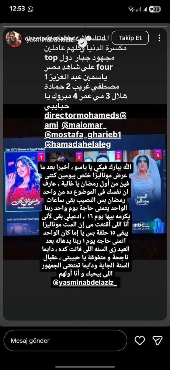 وشاركت ياسمين الخبر تصدر مسلسلها الأعلى مشاهدة عبر حسابها على “إنستجرام”، معلقة عليه: “كل المسلسلات ما شاء الله مكسرة الدنيا، وكلهم عاملين مجهود جبار، دول Top Four على شاهد مصر: ياسمين عبد العزيز، ثم مصطفى غريب، ثم حمادة هلال، ثم مي عمر.. مبروك يا حبايبي”.