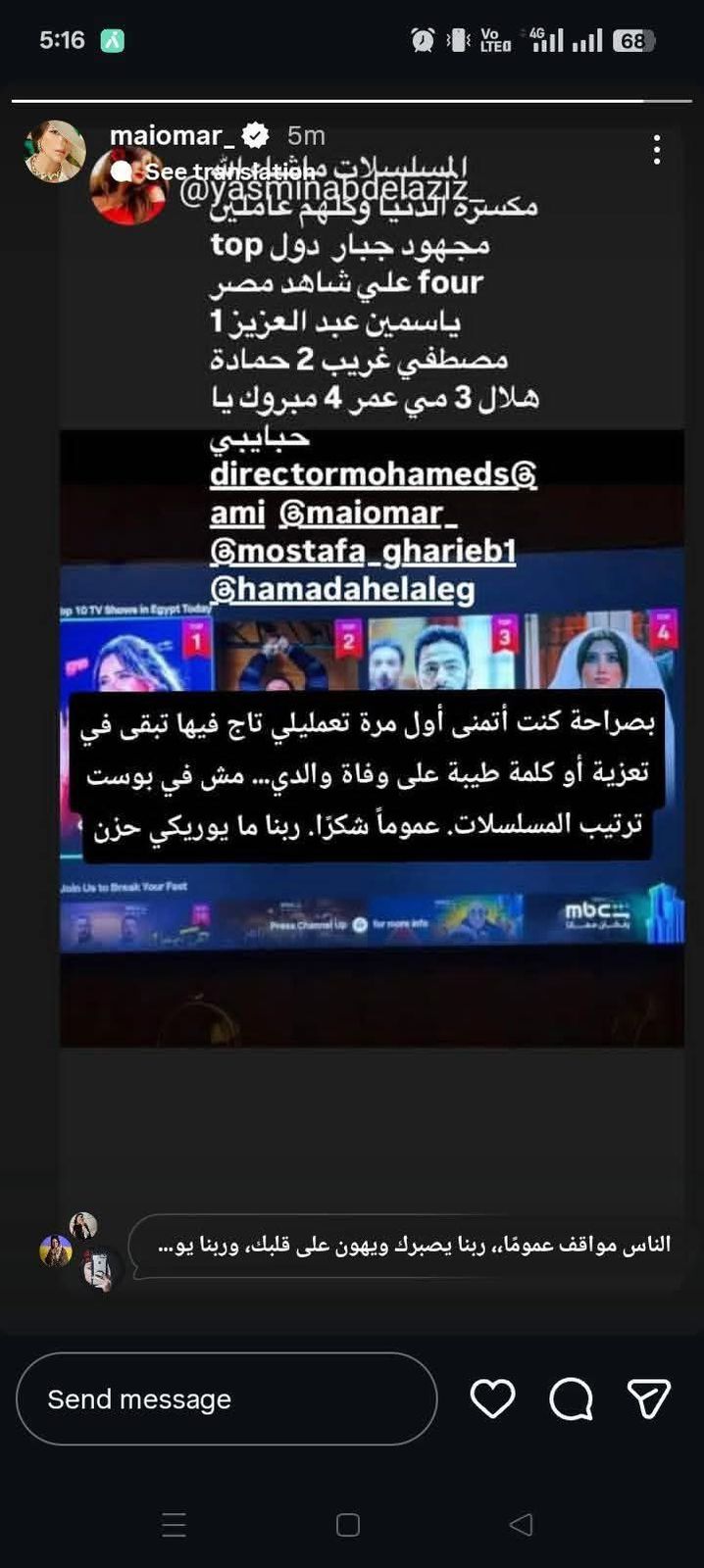 وعلقت مي عمر عبر حسابها على منصة “إنستجرام”: “بصراحة كنت أتمنى أول مرة تعمليلي تاج فيها تبقى في تعزية أو كلمة طيبة على وفاة والدي مش في بوست ترتيب مسلسلات، عمومًا شكرا ربنا ما يوريكي حزن”.