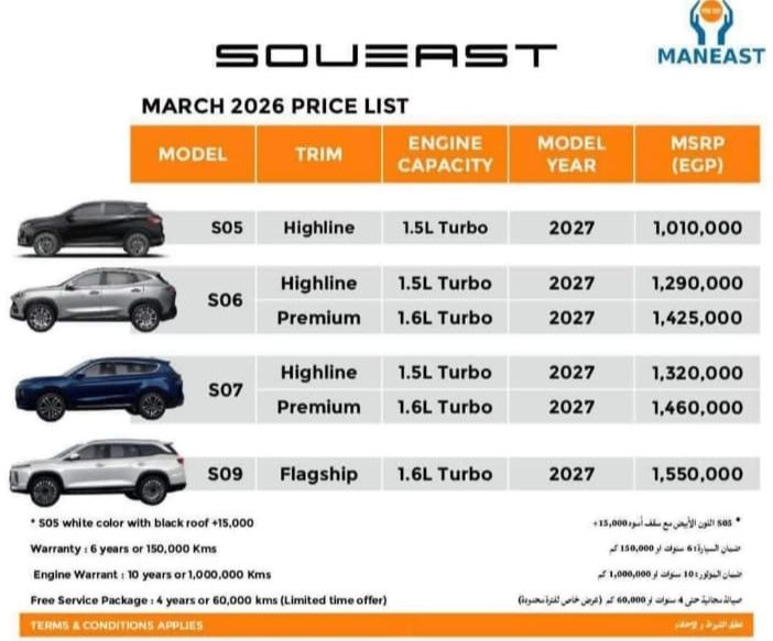 كشفت شركة MANEAST، الوكيل الحصري لسيارات سوإيست Soueast في مصر، أسعار سيارات سوإيست 2027 في السوق المحلي، بعد طرح 4 طرازات رسميًا.